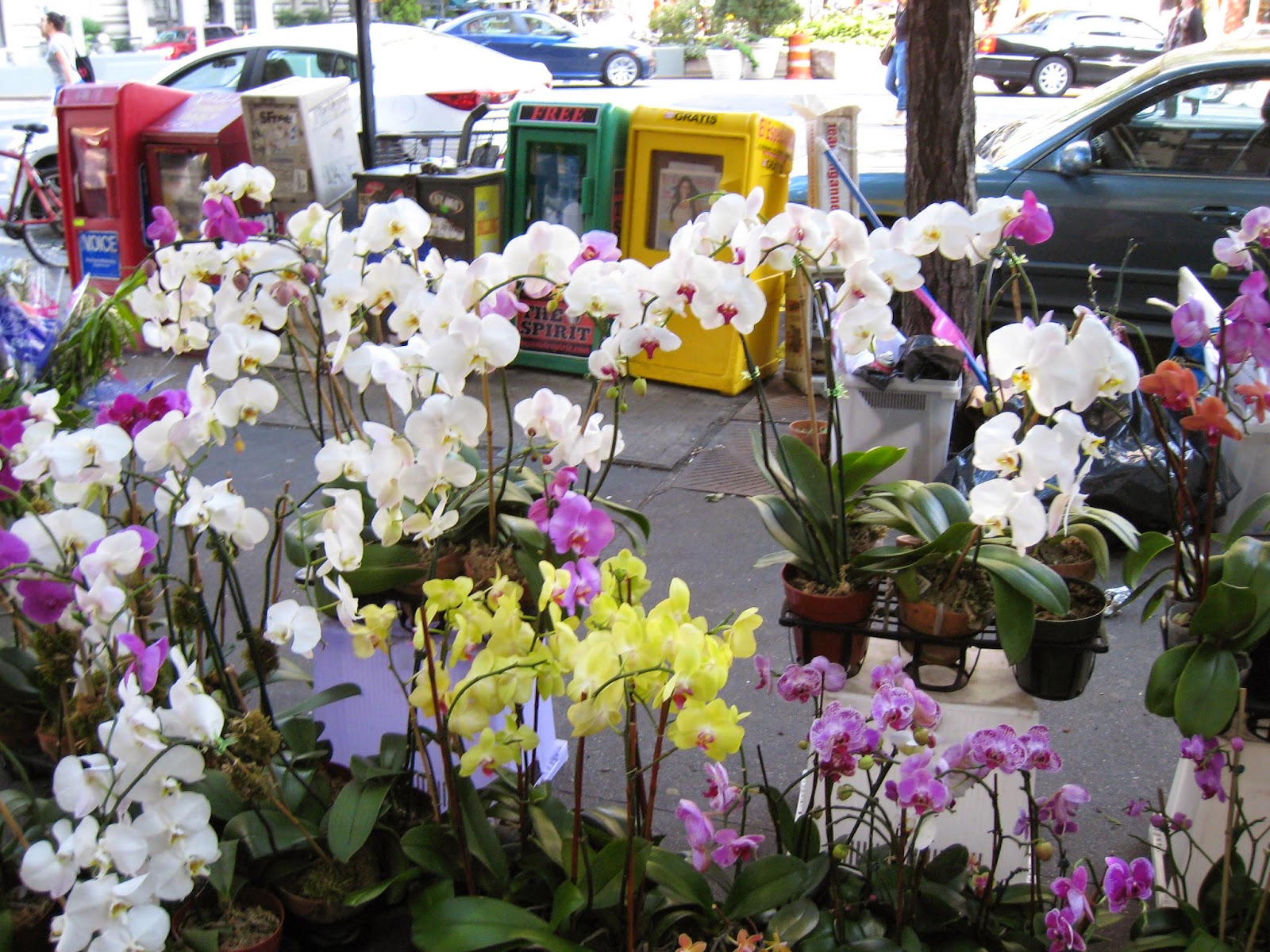 Most of the flowers always look a bit bedraggled, but clearly some folks are attracted by them and make purchases. Behind these orchids you can see multi-colored "street furniture" that contain various free newspapers.